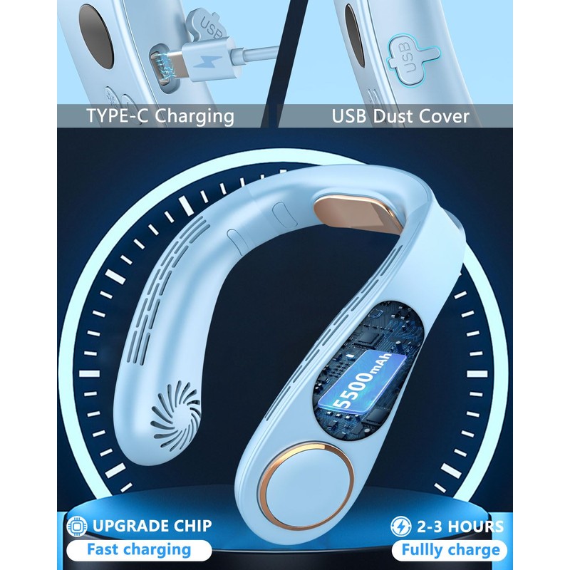 - ❄【Fast Charging & Best Gifts for Lovers】Neck fan air conditioner built-in 5500mAh Rechargeable battery,upgrade the fast charged chip and comes with one TYPE-C fast charge cable. You can use 5V/2A charger to quickly charge in 2.5-3 hours.Charging port with USB dust cover to prevent dust from entering. Lightweight portable neck ac,hands free ac neck cooler providing cooling down anytime,anywhere. Cooling neck fan with ac is the best choice for mothers day gifts, fathers day gifts, birthday gifts