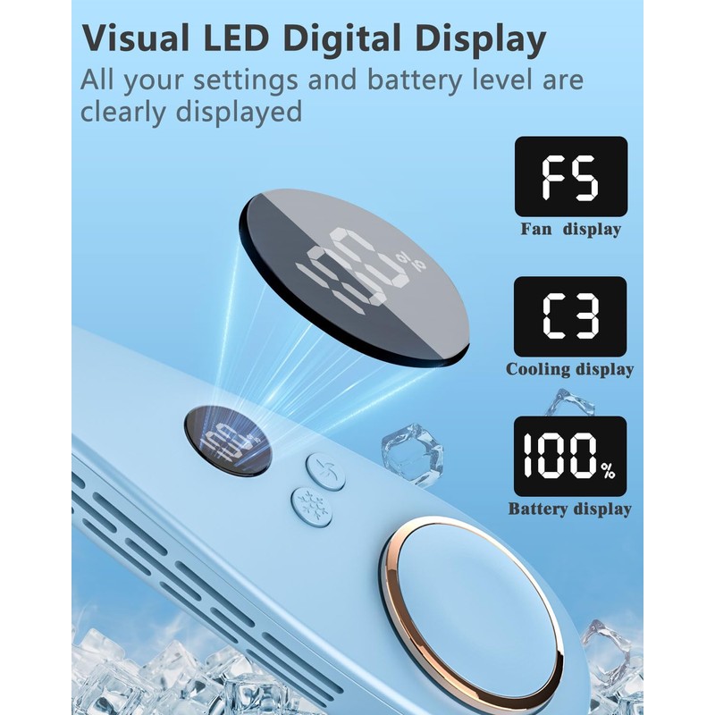 - ❄【LED Display&User Friendly neck ac fan】Neck fan cooling plate with visual LED display, allowing you to check cooling modes, fan speeds, and remaining battery power at any time. No need to worry about neck cooling fan with cold air 's battery unexpectedly running out and affecting usage. The fan speeds and cooling functions of neck ac air conditioner are controlled by 2 separate buttons. Whether you need a soft breeze or powerful cooling, simply press the buttons to adjust