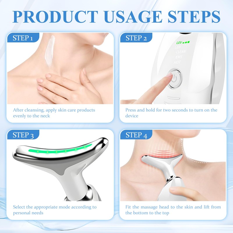 - Multifunctional anti-wrinkle facial device: This face tightening device offers 3 vibration levels, 7 LED light modes, micro current (EMS), constant 45°C heat massage and high frequency vibration. A facial massager with high frequency vibration can stimulate the muscles and prevent wrinkles and skin ageing. It can increase nutrient absorption, tighten the skin and reduce fine lines and wrinkles on the neck better than a conventional hand massage.