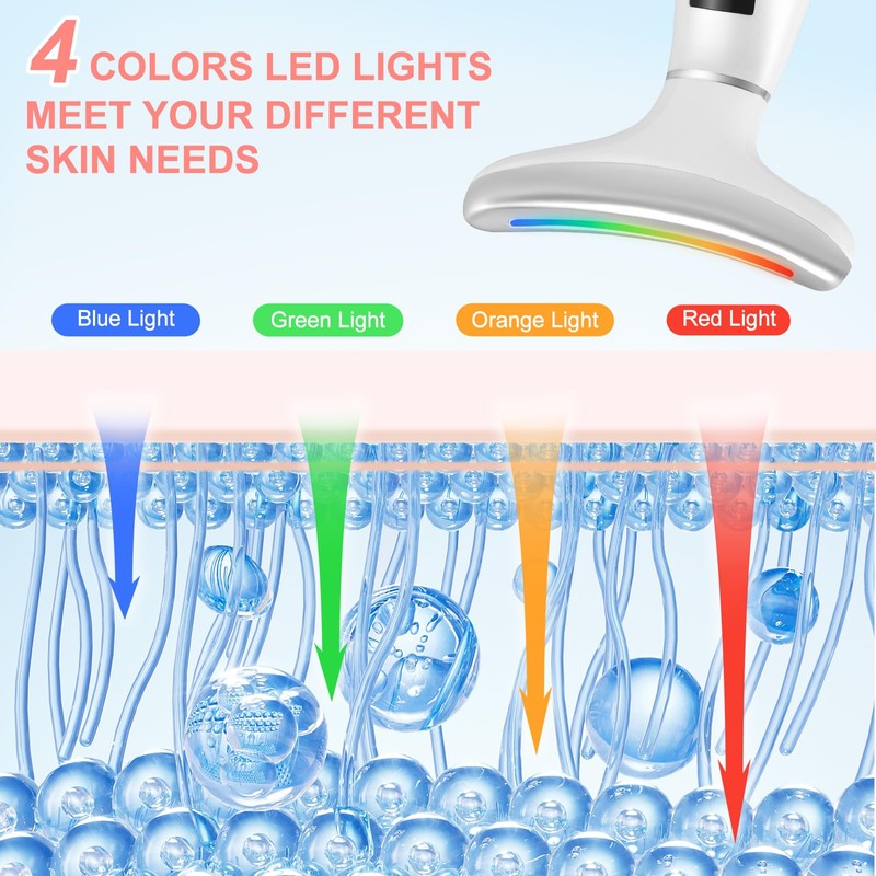 - 【4 Colors LED Light】This facial massager electric has 4 LED light modes: blue, green, orange, and red. Blue light can restore skin elasticity and firm the skin; green light can balance the skin tone and introduce nutrition; orange light can intensively repair and light wrinkles and hidden lines; red light can accelerate circulation and rejuvenate the skin.