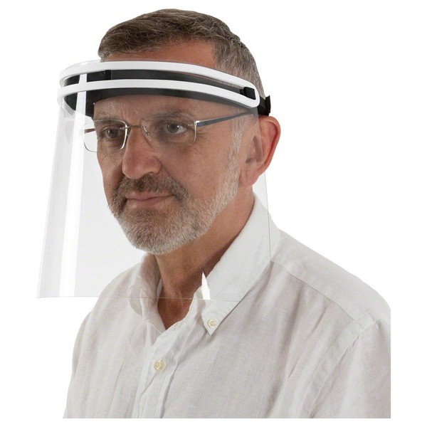 The face shield is suitable for protecting the environment from droplets caused by coughing and sneezing. The face shield has a soft elastic band that adapts to the individual head shape and is comfortable to wear. Soft foam cushions the forehead area, so that the shield sits comfortably even during prolonged wear and does not become uncomfortable. Ventilation holes in the forehead area ensure good ventilation, but can also be closed if necessary. A clear plastic disc covers the entire face. Due to the low weight of only 64 g, the long wearing of the face shield is comfortable and is therefore also especially suitable for people who have to wear a mouth and nose guard for a long period of time. Product features: universal size, comfortable elastic band, soft forehead support, ventilation in the forehead area, weight: approx. 64 g.