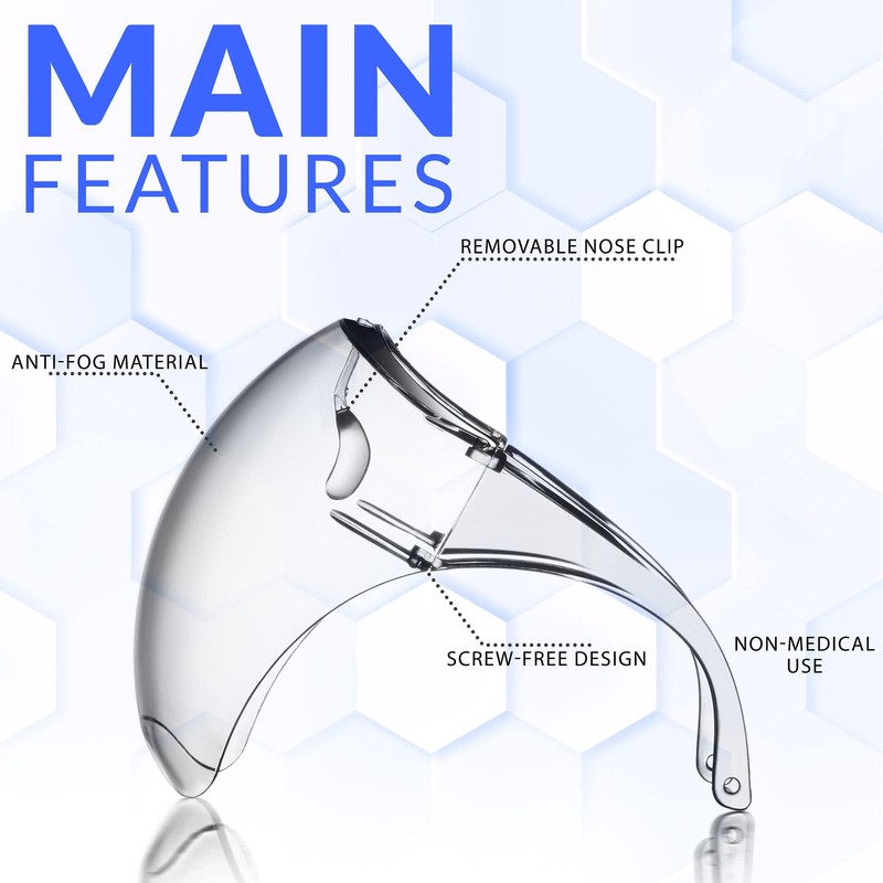 - ✅ DESIGNED FOR COMFORT - lightweight premium protective face shields are made with ultra-clear thick PET plastic. Wear our face shields just like you would when wearing glasses over your ears and on your nose bridge. Do not affecting your breathing like traditional shields.