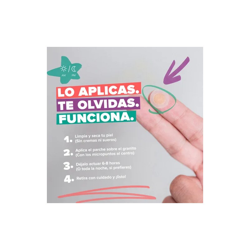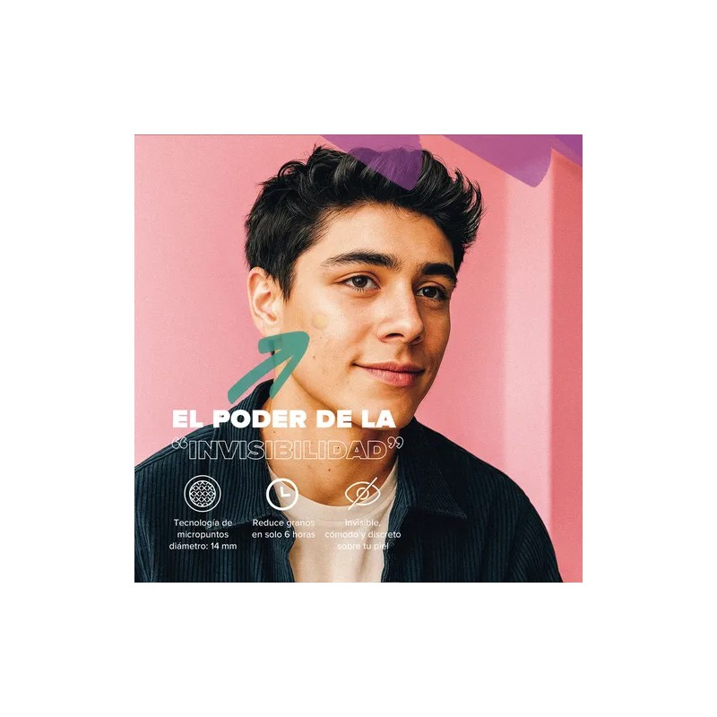 Parches anti acne transparentes con tecnología micropuntos que van al grano en cualquier momento. Los micropuntos depositan ingredientes activos en las capas más profundas de la piel y aceleran el proceso de recuperación del granito.
