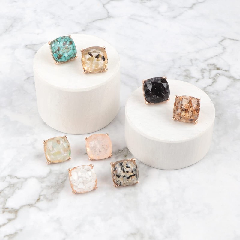 Faceted Jewel Statement Stud Earrings - Cushion Cut Square Glitter, Opalescent Faux Pearl Shell (Cushion Square Natural Stone - Dalmatian)