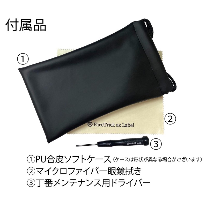 - Comes with a 3-piece care set. 1. San Nishimura Japanese screwdriver; 2. Glasses cloth with FaceTrick az Label logo; 3. Soft case