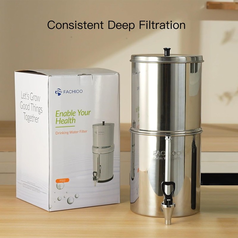 FACHIOO 2.25G Gravity Water Filter System, 304 Stainless Steel Countertop System with 2 Ceramic Filters and Stainless Steel Spigot, Reduce Chlorine, for Home, Camping, RVing, Off-Grid, Emergencies