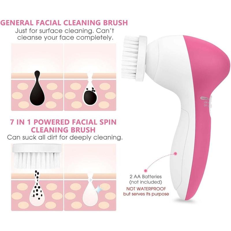 - Soft brush Made of 0.05s nylon bristles helps to remove sebum and dullness for sensitive skin, soft and comfortable. - Cleanse for more radiant skin. - Prevents clogged pores and acne. - For gentle daily cleansing. Silicone brush Ultra Hygienic Soft Rubber, More gentle for people with sensitive skin. Meaning you can get a much gentle cleanse. - Hugs skin for a balanced clean. - Skin feels softer and fresher. - Suitable for all skin types. Coarser brush Made of 0.08s nylon bristles to help flush and dislodge oil and debris that clogs pores, soft touch for normal skin. - Helps to remove excess oil. - Skin appears smoother. - For deep cleansing. Latex head Make-up removal and facial cleansing. Rolling massager Massaging acupoints. Also, it can combine with skin care products. Sponge head Cleansing of cream, foundation or powder. You can clean the brushes by rinsing under warm running water and allowing them to air dry. With the skin care system, you can have a full spa-quality skin care regimen any time you want, with hardly any effort. The whole kit is small enough to take with you to the gym, to work, on vacation or business trips, so you can always be looking and feeling terrific. With the two-speed motor you can choose from gentle or vigorous, and with seven heads, you'll always have the exact right tool for every job. From a gentle wash to deep pore cleansing, from exfoliation to callus removal, this kit gives you everything you need to keep your skin looking and feeling its best. There's even a rolling massager head to improve blood circulation and tone facial muscles for a fresh, youthful glow. Tips: This unit is not waterproof. Do not expose device to water. 6 IN 1 FACE CLEANSING BRUSH SET - This 360-degree rotation exfoliating face cleanser brush greatly boosts the performance of your skincare regime. You can adjust any head so as to adapt to your skin needs. 2 SPEEDS FOR 2 CLEANS - Our facial cleansing brush has 2 rotation speeds meet the cleansing needs, including: “Low” for daily cleaning, “High” for exfoliation. The motor is designed to provide sufficient rotation power for the spin brush, which is 6 times more effective than washing by hands. RADIANT RESULTS AFTER EVERY CLEANSE - You can use it with any face cleanser or essential oils. This facial cleansing brush boosts the performance of your cleanser for a deep clean. From a gentle scrubbing to deep pore cleansing and massage your face, from exfoliation to callus. Enjoy spa-quality skin care in your own home and while you travel. NOT WATERPROOF BUT SERVES Its PURPOSE - For the facial cleansing brush to last, Do not expose device to water; Please keep the battery compartment dry and cleaned the device with cloth after use. Powered by 2 AA batteries (Not Included). FACE CLEANER KIT INCLUDES - 6 replaceable brush heads: Two small brushes for daily gentle cleansing, sponge head, latex head, a silicone brush head and a rolling massage head For massage acupoints.