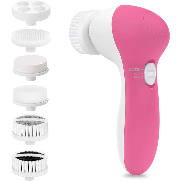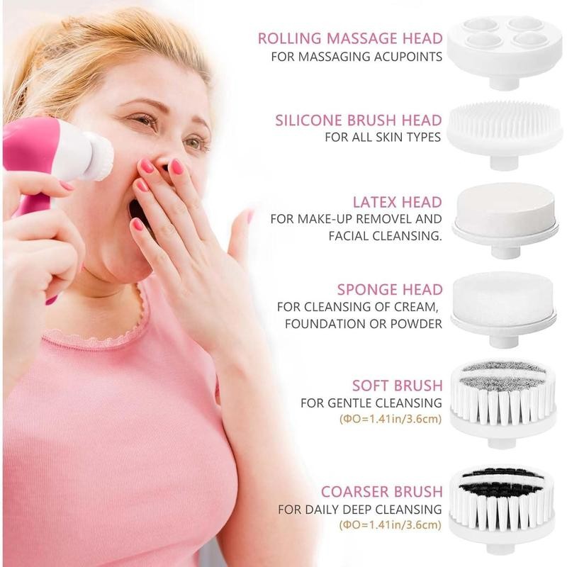 - Soft brush Made of 0.05s nylon bristles helps to remove sebum and dullness for sensitive skin, soft and comfortable. - Cleanse for more radiant skin. - Prevents clogged pores and acne. - For gentle daily cleansing. Silicone brush Ultra Hygienic Soft Rubber, More gentle for people with sensitive skin. Meaning you can get a much gentle cleanse. - Hugs skin for a balanced clean. - Skin feels softer and fresher. - Suitable for all skin types. Coarser brush Made of 0.08s nylon bristles to help flush and dislodge oil and debris that clogs pores, soft touch for normal skin. - Helps to remove excess oil. - Skin appears smoother. - For deep cleansing. Latex head Make-up removal and facial cleansing. Rolling massager Massaging acupoints. Also, it can combine with skin care products. Sponge head Cleansing of cream, foundation or powder. You can clean the brushes by rinsing under warm running water and allowing them to air dry. With the skin care system, you can have a full spa-quality skin care regimen any time you want, with hardly any effort. The whole kit is small enough to take with you to the gym, to work, on vacation or business trips, so you can always be looking and feeling terrific. With the two-speed motor you can choose from gentle or vigorous, and with seven heads, you'll always have the exact right tool for every job. From a gentle wash to deep pore cleansing, from exfoliation to callus removal, this kit gives you everything you need to keep your skin looking and feeling its best. There's even a rolling massager head to improve blood circulation and tone facial muscles for a fresh, youthful glow. Tips: This unit is not waterproof. Do not expose device to water. 6 IN 1 FACE CLEANSING BRUSH SET - This 360-degree rotation exfoliating face cleanser brush greatly boosts the performance of your skincare regime. You can adjust any head so as to adapt to your skin needs. 2 SPEEDS FOR 2 CLEANS - Our facial cleansing brush has 2 rotation speeds meet the cleansing needs, including: “Low” for daily cleaning, “High” for exfoliation. The motor is designed to provide sufficient rotation power for the spin brush, which is 6 times more effective than washing by hands. RADIANT RESULTS AFTER EVERY CLEANSE - You can use it with any face cleanser or essential oils. This facial cleansing brush boosts the performance of your cleanser for a deep clean. From a gentle scrubbing to deep pore cleansing and massage your face, from exfoliation to callus. Enjoy spa-quality skin care in your own home and while you travel. NOT WATERPROOF BUT SERVES Its PURPOSE - For the facial cleansing brush to last, Do not expose device to water; Please keep the battery compartment dry and cleaned the device with cloth after use. Powered by 2 AA batteries (Not Included). FACE CLEANER KIT INCLUDES - 6 replaceable brush heads: Two small brushes for daily gentle cleansing, sponge head, latex head, a silicone brush head and a rolling massage head For massage acupoints.