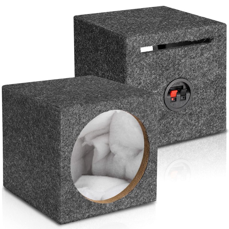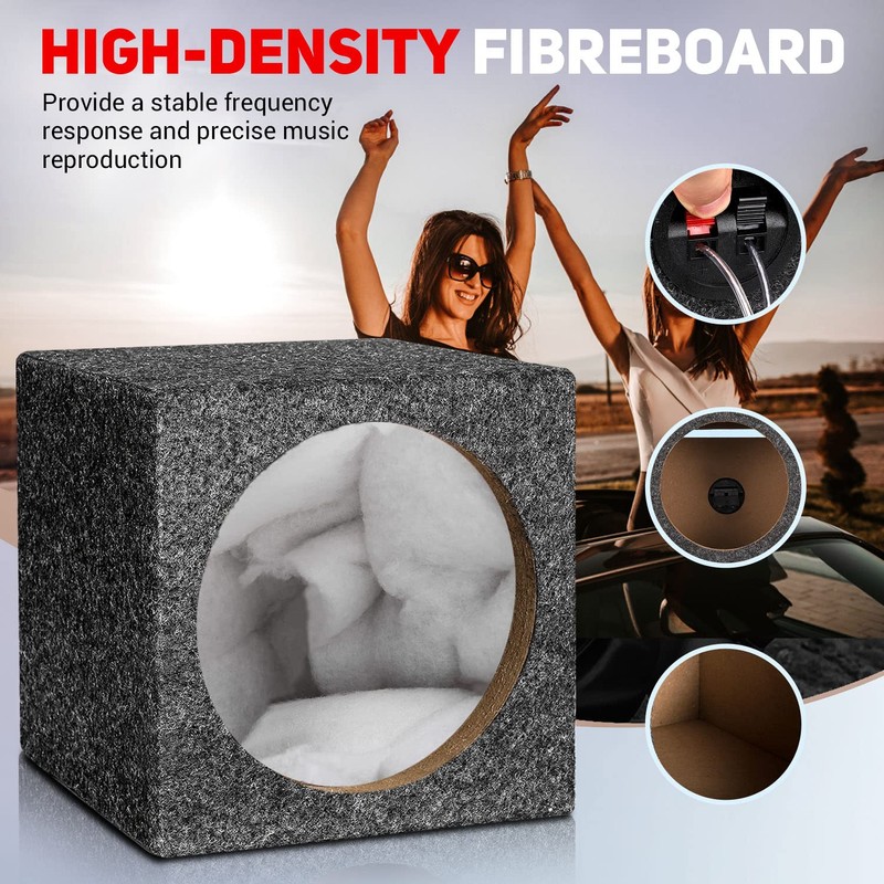 - 【Made of Premium Material】-- Great High-Density Fibreboard was used in the construction of this speaker box to provide a stable frequency response and precise music reproduction. This speaker inclosure has Premium grey carpet that complements the majority of automobile interiors. This is the ideal accessory to help you create the ideal sound system.