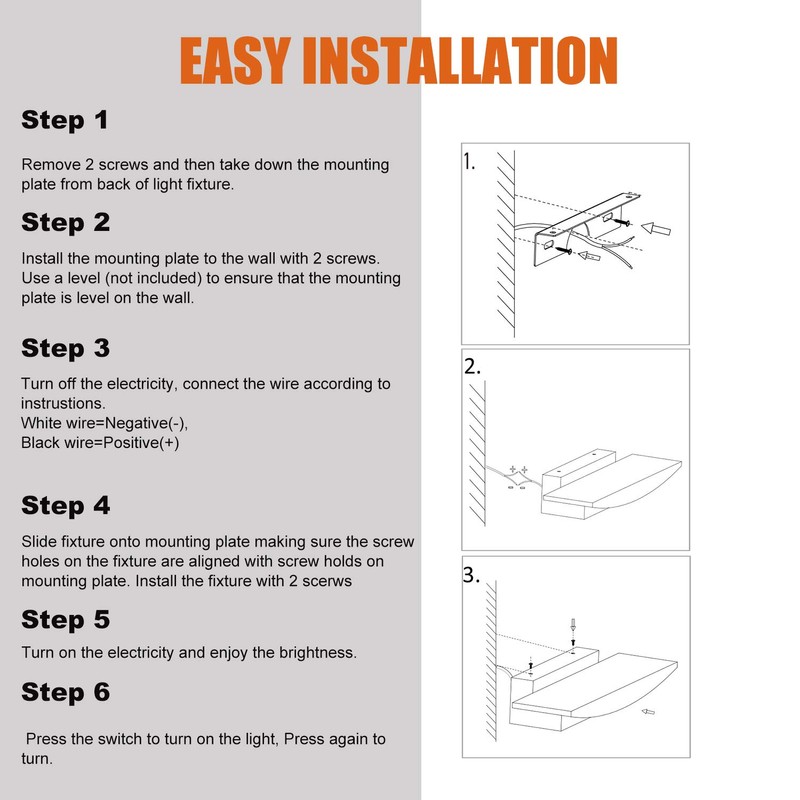 - 【✅Easy Installation】Size: Length 11-3/4'' x Width 3-1/8'' x Height 2-3/8''. Wall Sconce Shade Design Make it more Safe and Easy Installation with Only 2 Screws (Included). 2 Wire Designed - Black Wire=Positive (+), White Wire= Negative (-)