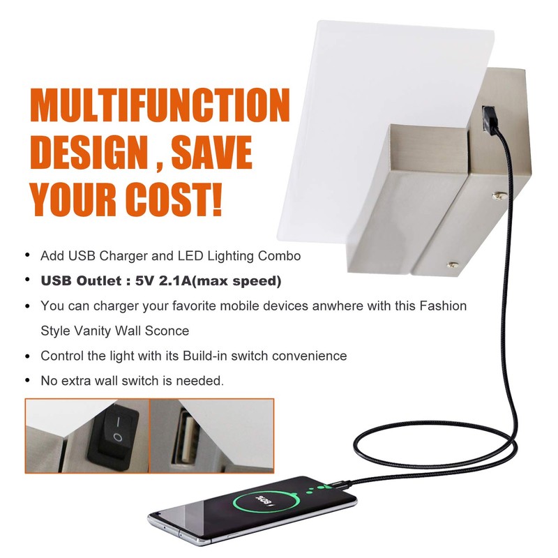 - 【✅USB Charger Socket Function】LED Wall Sconce Bedside Reading Comes with Convenience USB Charger Socket. 5V / 2.1A USB High Speed Car Charger charges your favorite mobile devices including the iPad (max speed), iPhone (max speed), iPod, HTC, Galaxy, Blackberry, MP3 Players, Digital Cameras, PDAs, Mobile Phones.