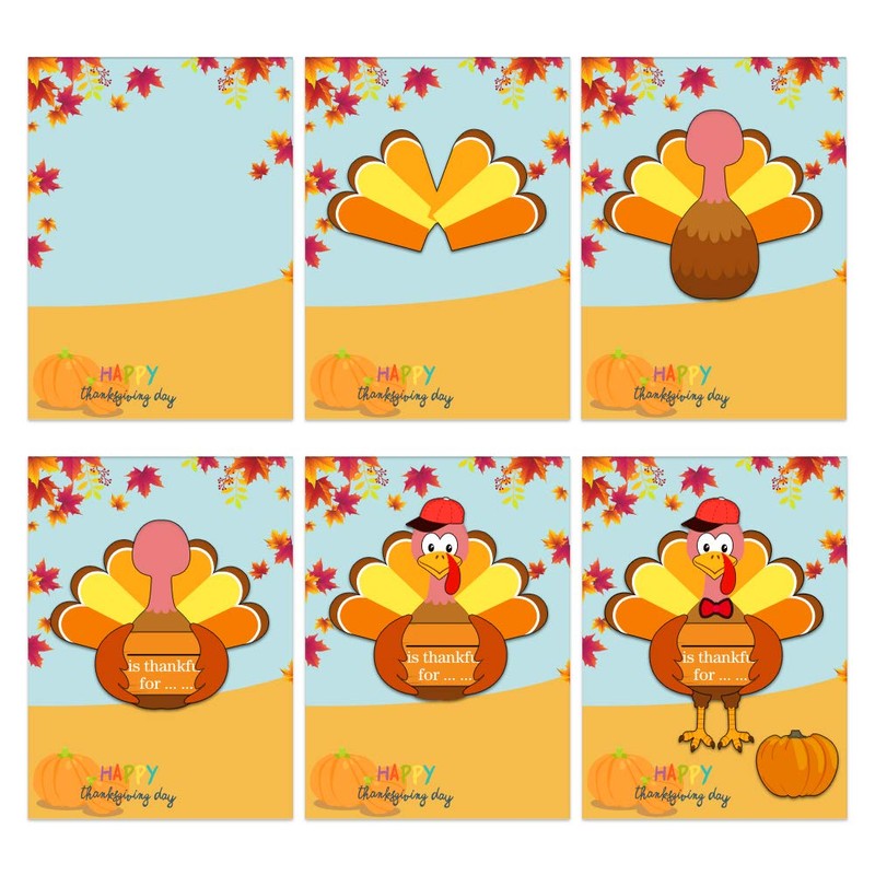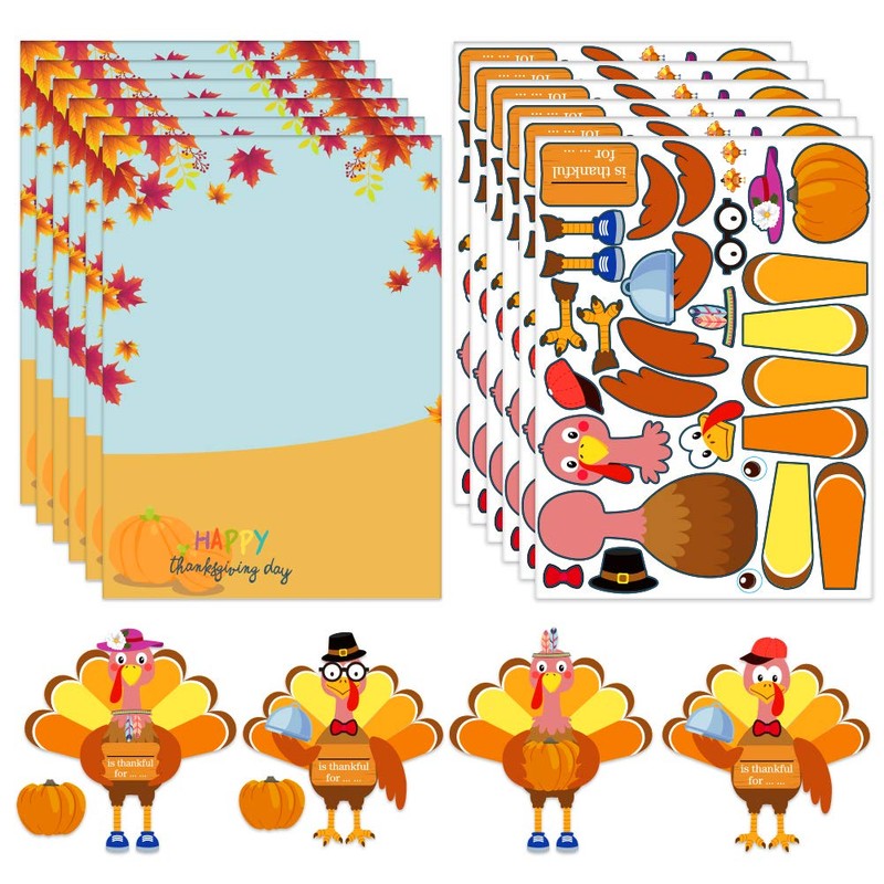 - PACKAGE INCLUDE: Including 12 Sheets DIY make-a-turkey craft sticker and 12 Sheets Thanksgiving Cardboards, each style size is 8" x 11".children can stick different body parts and accessories of turkey decorations in cardboard according to their preference.