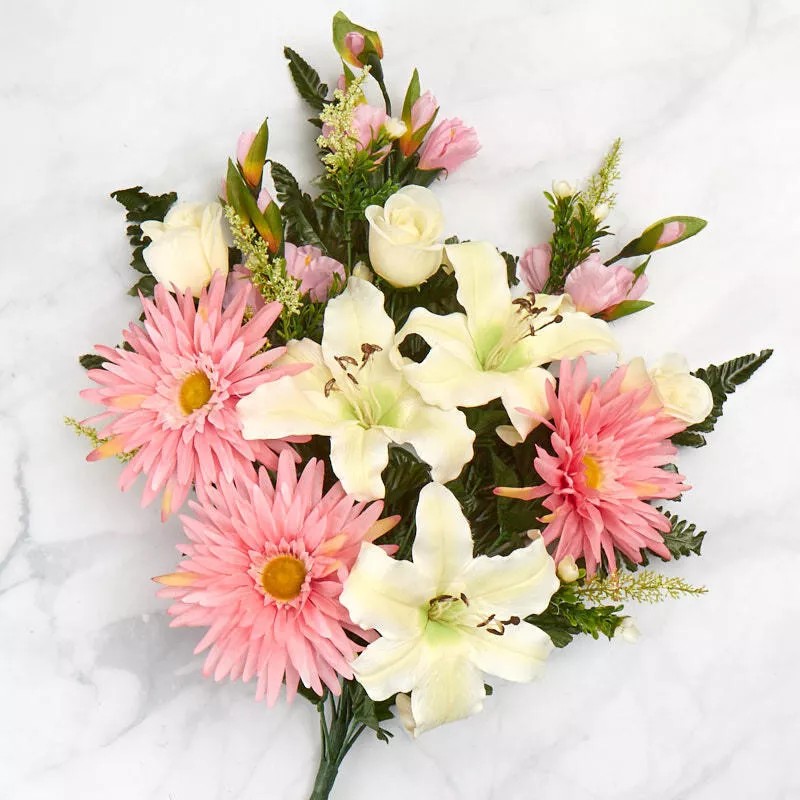 This poly silk mixed gerbera daisy, lily and gladiolus half bush is designed to lie flat against cemetery headstones, the perfect way to decorate agrave site.
