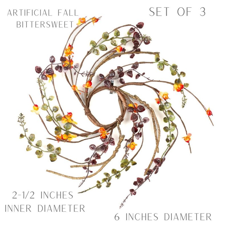 • These 3 Artificial Bittersweet Candle Wreath Rings are perfect from the early Fall season through Thanksgiving Day!