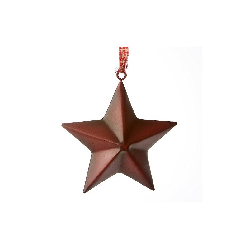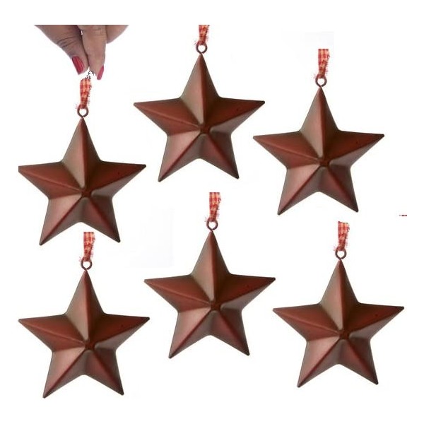 - SET of 6 - Primitive Farmhouse Dimensional Barn Star Ornaments with Checked Hangers