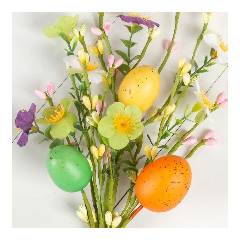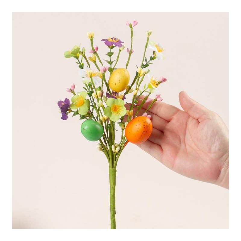 - VERSATILE: These 6 Artificial Easter Egg Picks are perfect for Easter and Spring Holiday Decorating and Displaying. Each stem has 3 colorful Easter eggs, tiny polysilk blooms, and pip berries, perfect for adding a springtime touch to your decor.