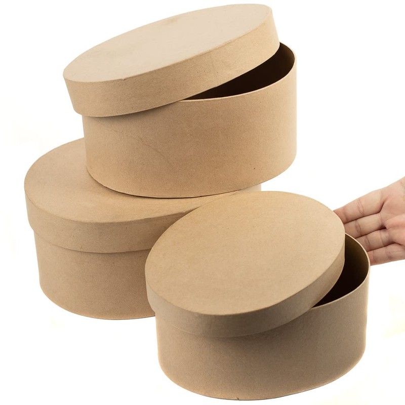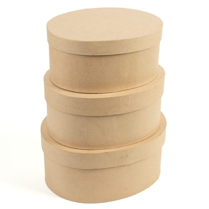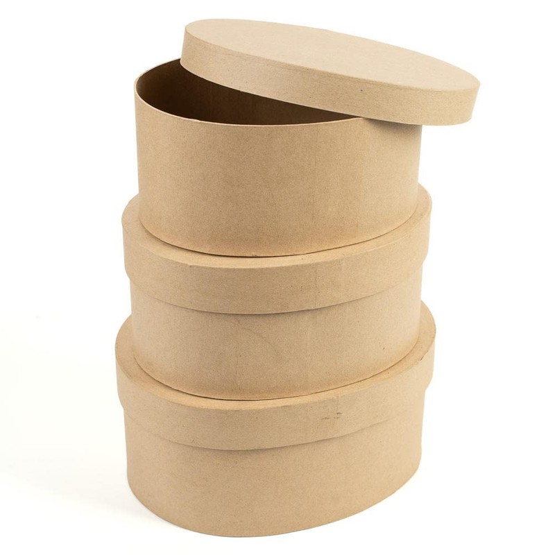 - LET YOUR CREATIVITY SHINE – This set of 3 Paper Mache Oval Boxes with Lids are a blank canvas for creativity. Let your personality shine through colors, designs and embellishments. Create card boxes, centerpieces, holiday gifts and more.