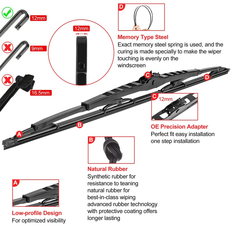 - 【High Quality Steel 】:We use space high alloy medium carbon steel, excellent high toughness ultra high strength steel, when it rains heavily, wiper swing, will not be affected by resistance, steel sheet deformation bending,Frame - 100% PBT with 30% PB, firm without losing toughness. Blade - ABSP silicone rubber, wipe clear, soft and durable