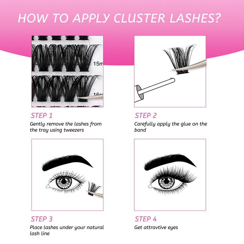 - Comfortable to wear: press the band of the individual eyelashes together with tweezers and apply from the bottom. Hold easily on the eye and the adhesive area is barely noticeable. The band of the eyelash clusters is flat and barely noticeable and does not feel any discomfort when blinking.