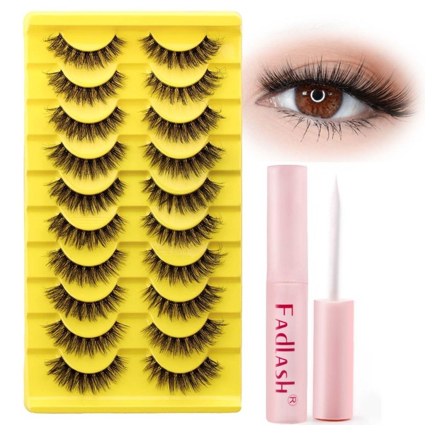 FADLASH Natural False Eyelashes Wispy Lashes 𝟏𝟎 𝐏𝐚𝐢𝐫𝐬 Cat Eye Lashes with Lash Bond Soft Fluffy Lashes Extension Kit 3D Volume Fake Lashes Strips Lashes (LZ201)