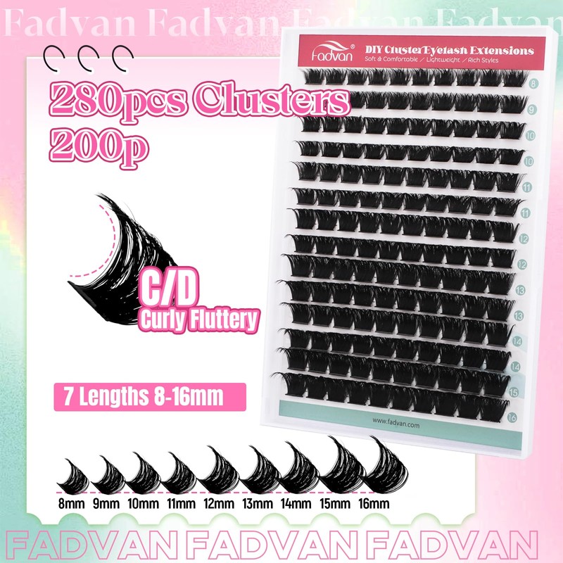 - 200D FLUFFY NATURAL CLUSTER LASHES: 140pcs wispy lashes clusters are designed with 200d volume, more fluffy and natural than other lash, creating fluffy and charming eyelash extension look with 9 lengths of eyelashes clusters(8-16mm). Dramatic cat's eyes, natural eyelash effects, cute baby eyes and more.