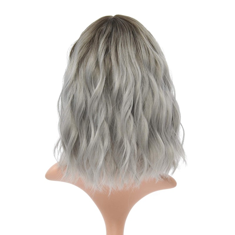FAELBATY Ombre Grey Wig Short Bob Wigs with Air Fringe Women's Short Wig Curly Wavy Synthetic Cosplay Wig for Girls Costume Wigs (12 Inches Dark Root Ombre Grey)