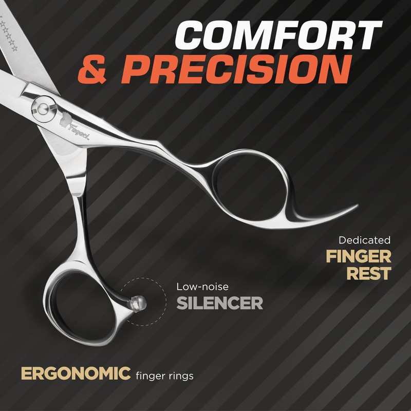- Comfortable & Smooth Motion - The handle of this shears hair professional is designed to perfectly fit the hand, so the cut is more precise and the comfort is increased. The joint of the blades is professional made, which is why the motion and the adjustment of this haircut scissors are very fine, with long-lasting resistance and reduced sound to motion.