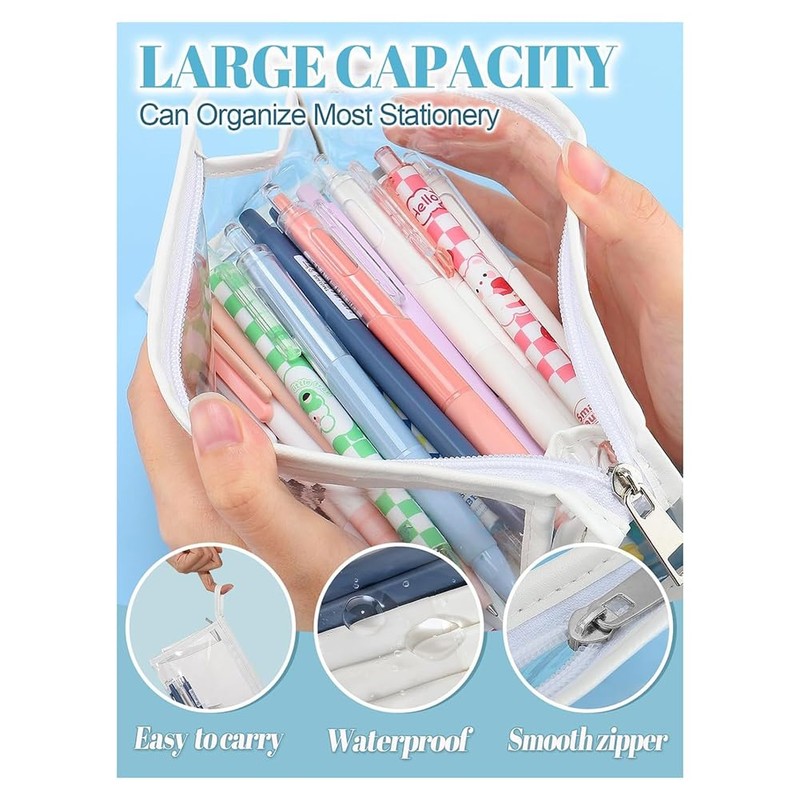 - The spacious pencil case can store gel pens, mechanical pencils, sticky notes, rulers, erasers, and more. Made of transparent PVC, it is easy to organize and quickly access supplies. Portable, waterproof, and wear-.