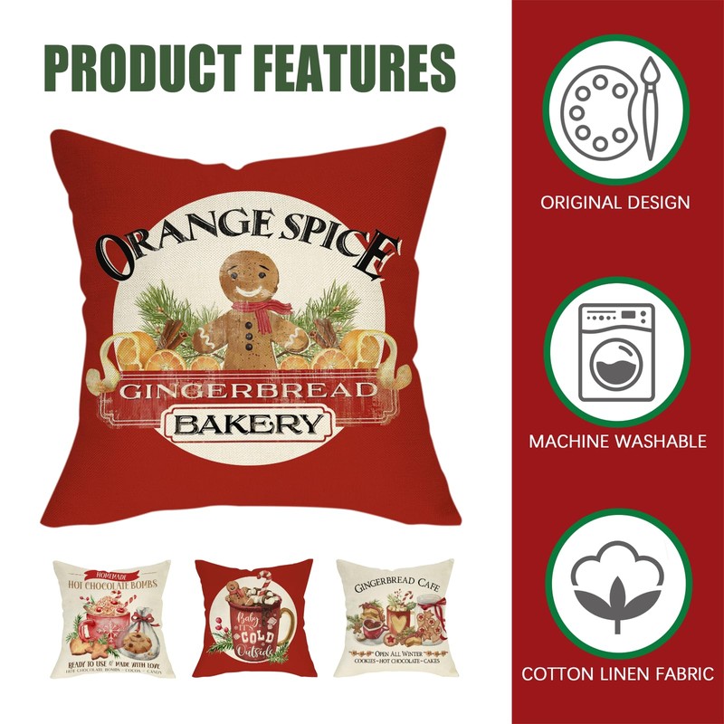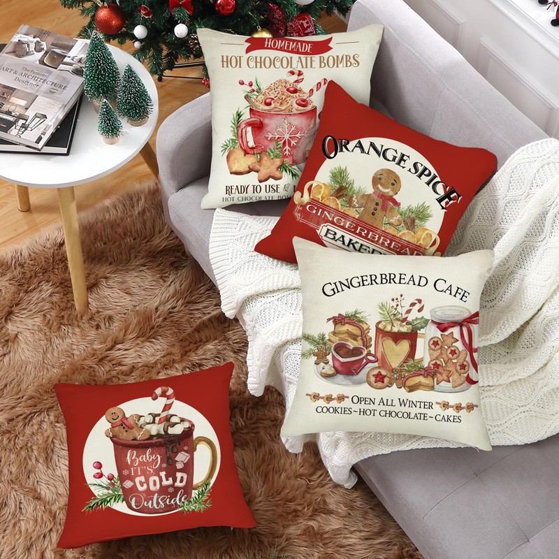 Fahrendom Christmas Gingerbread Red Decorative Throw Pillow Covers 18 x 18 Set of 4, Xmas Bakery Hot Cocoa Cookie Cafe Pillowcase Baking Lover Gifts, Winter Holiday Sofa Couch Cushion Case Home Decor