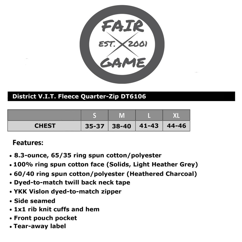 - PRODUCT QUALITY: 8.3 oz, Quarter-zip, front pouch pocket, Side seamed, 1x1 rib knit waistband and cuffs, Tear-away label. Unisex Sizing Fits Both Men and Women. Classic fit/traditional fit, American Standard Sizing. Refer to FAIR GAME size chart.