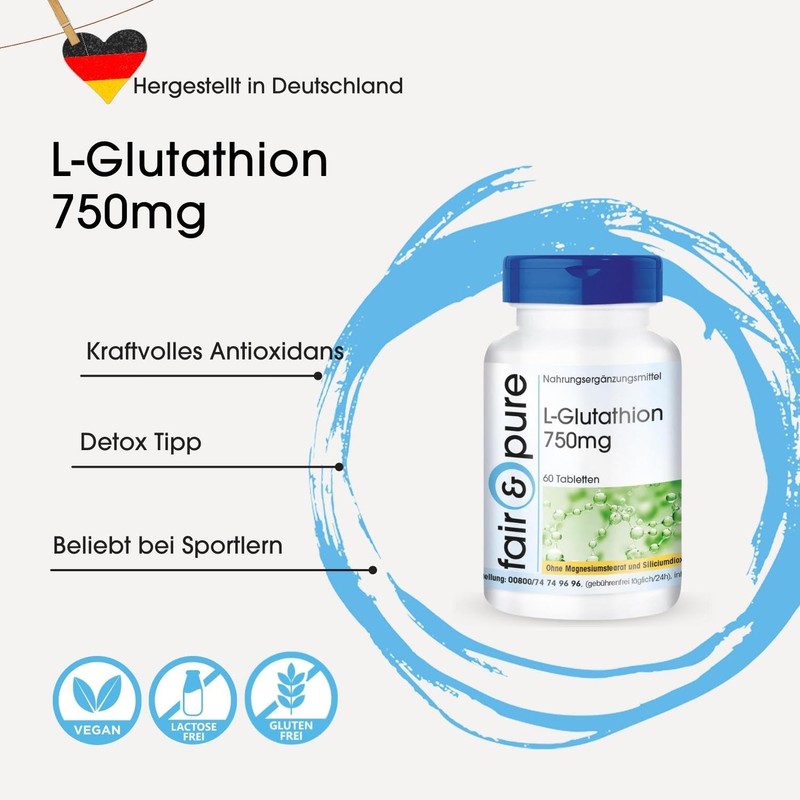 - For your health: L-glutathione 750 mg, reduced, vegan, high dose, 60 tablets. The product is gluten-free, fructose-free and lactose-free as well as free from magnesium stearate, silicon dioxide, colours, flavours and preservatives