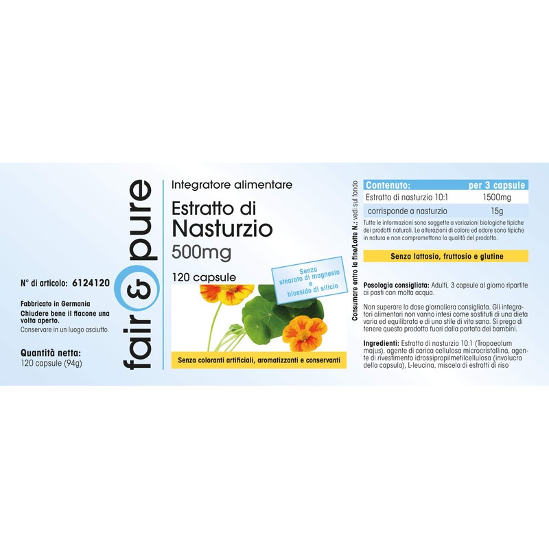 - For your health: nasturtium extract 500 mg, 10 times concentrated, vegan, 120 capsules – the product is gluten-free, fructose-free and lactose-free as well as free from magnesium stearate, silicon dioxide, colourings, flavours and preservatives
