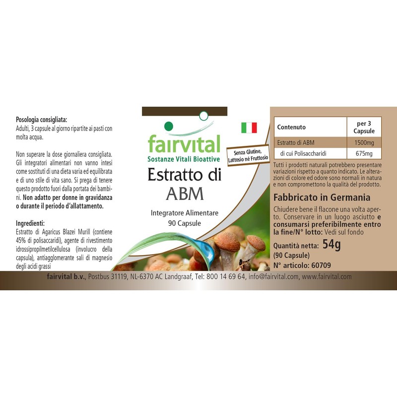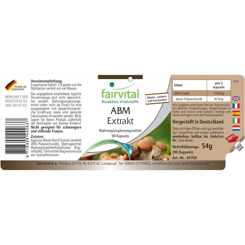 - ✔ fairvital German quality: daily dose: 3 capsules per day contain 1500 mg ABM extract, of which 675 mg polysaccharides. High dose. Excellent value for money!