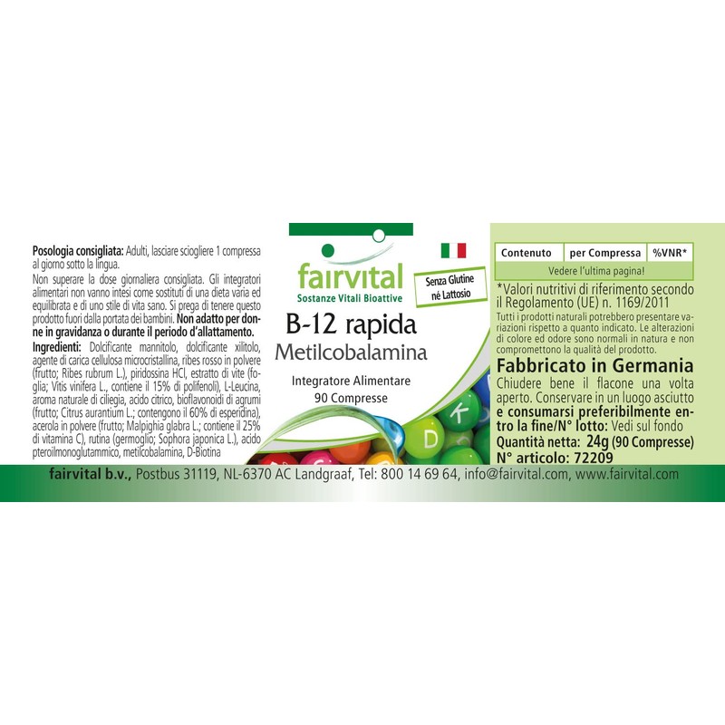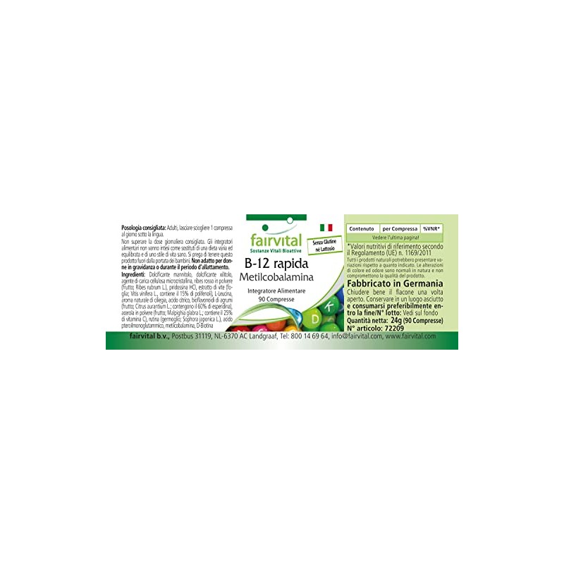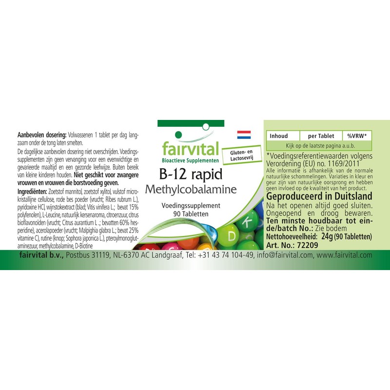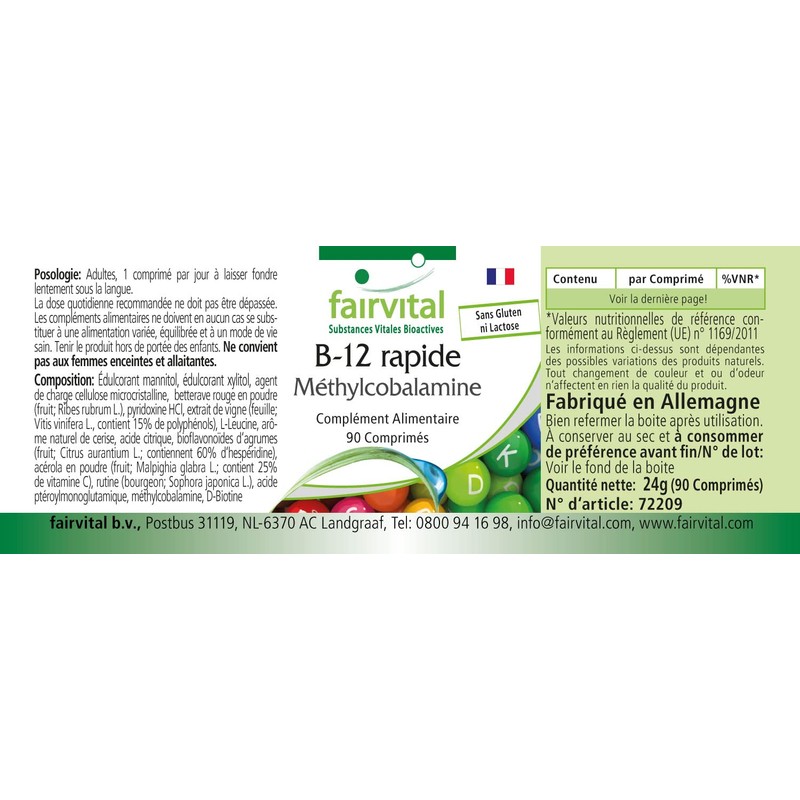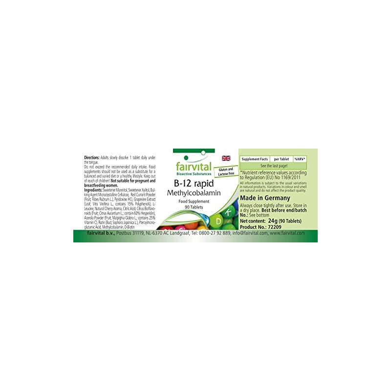 - ✔ fairvital German quality: daily dose: 1 sublingual tablet per day contains 6 mg vitamin B6, 500 μg vitamin B12, 800 μg folic acid, 100 μg biotin, 1 mg citrus bioflavonoids. of which 0.6 mg hesperidin, 1 mg rutin, 1 mg acerola, 4 mg grapevine extract, of which 0.6 mg polyphenols. High dose. Excellent value for money! B12, B6 and B9 contribute to normal homocysteine metabolism