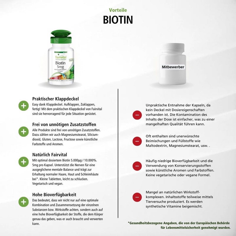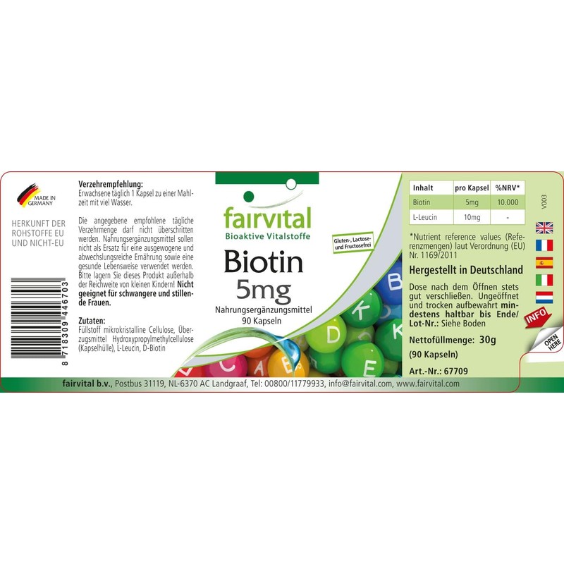 - ✔ fairvital German quality: daily dose: 1 capsule per day contains 5 mg biotin. High dose. Excellent value for money!
