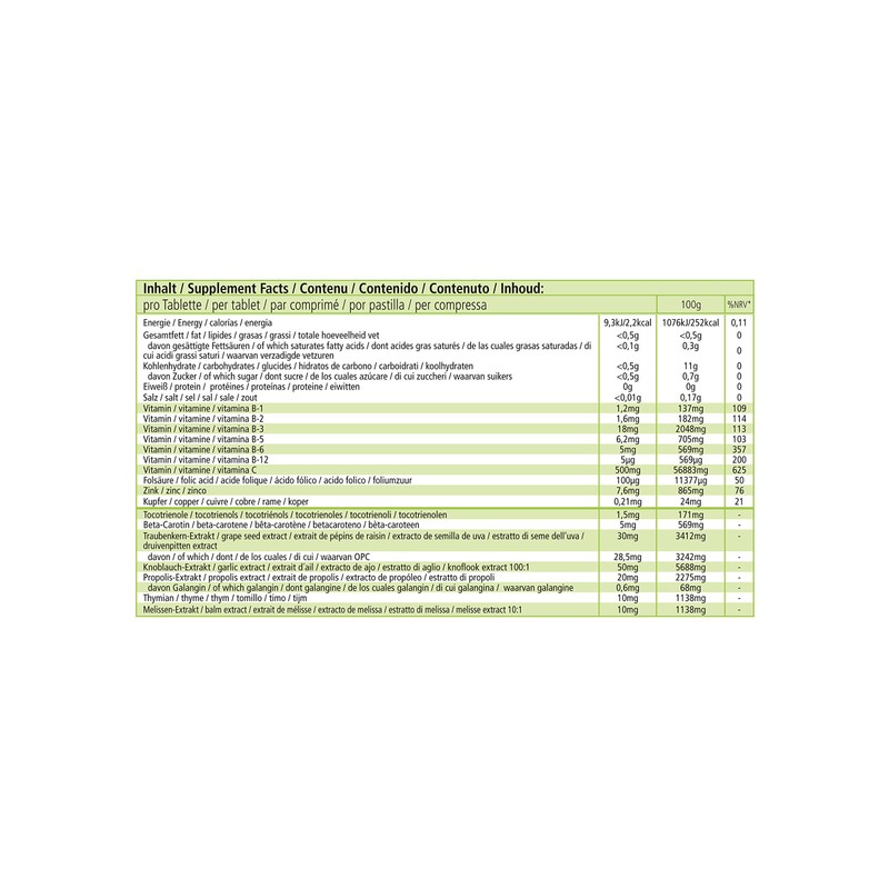 Ingredients: L-ascorbic acid, filler microcrystalline cellulose, garlic extract 100:1, magnesium oxide, grape seed extract (contains 95% OPC), beta-carotene, zinc citrate, propolis dry extract (contains 3% galangin), nicotinamide, balm extract 10:1, thyme. Leaf powder, Calcium-D-pantothenate, pyridoxine HCl, tocotrienol powder (contains 30% tocotrienols), cyanocobalamin, riboflavin, thiamine mononitrate, copper gluconate, pteroyl monoglutamic acid.