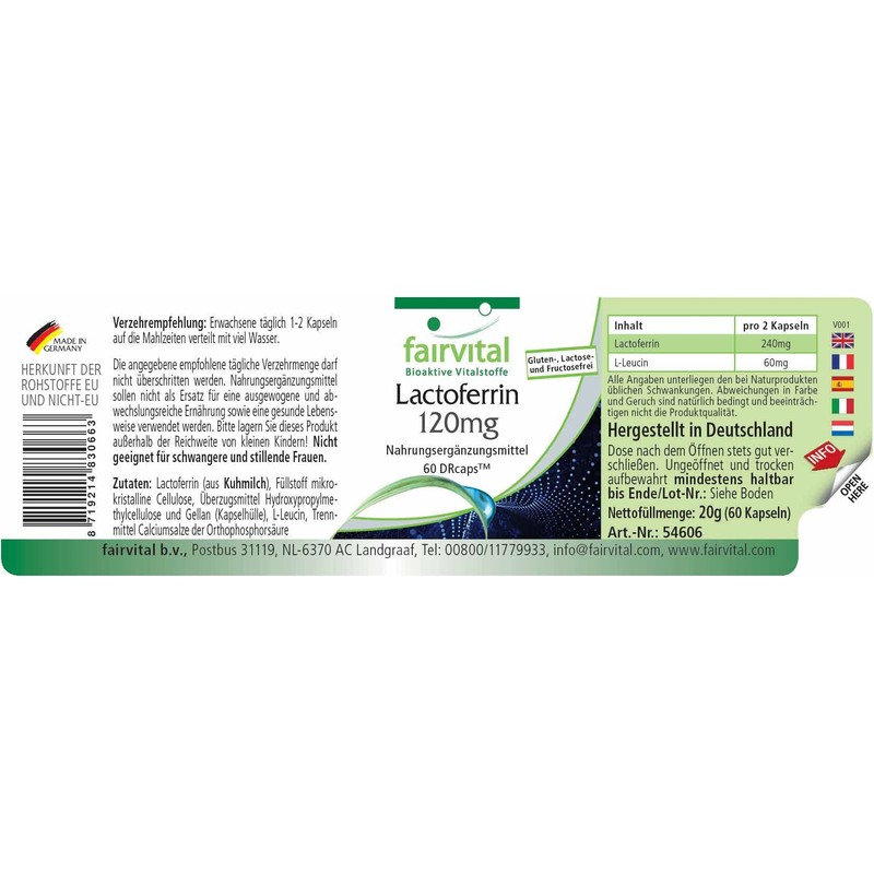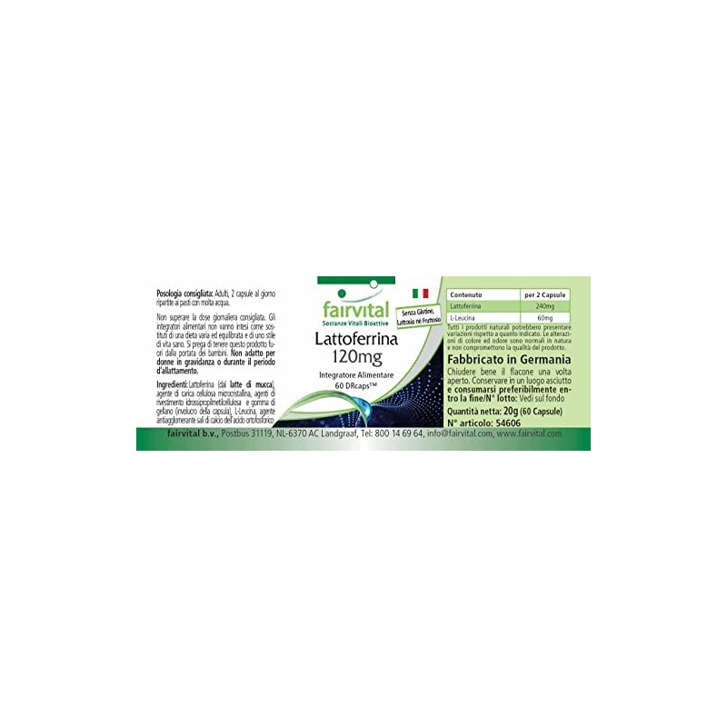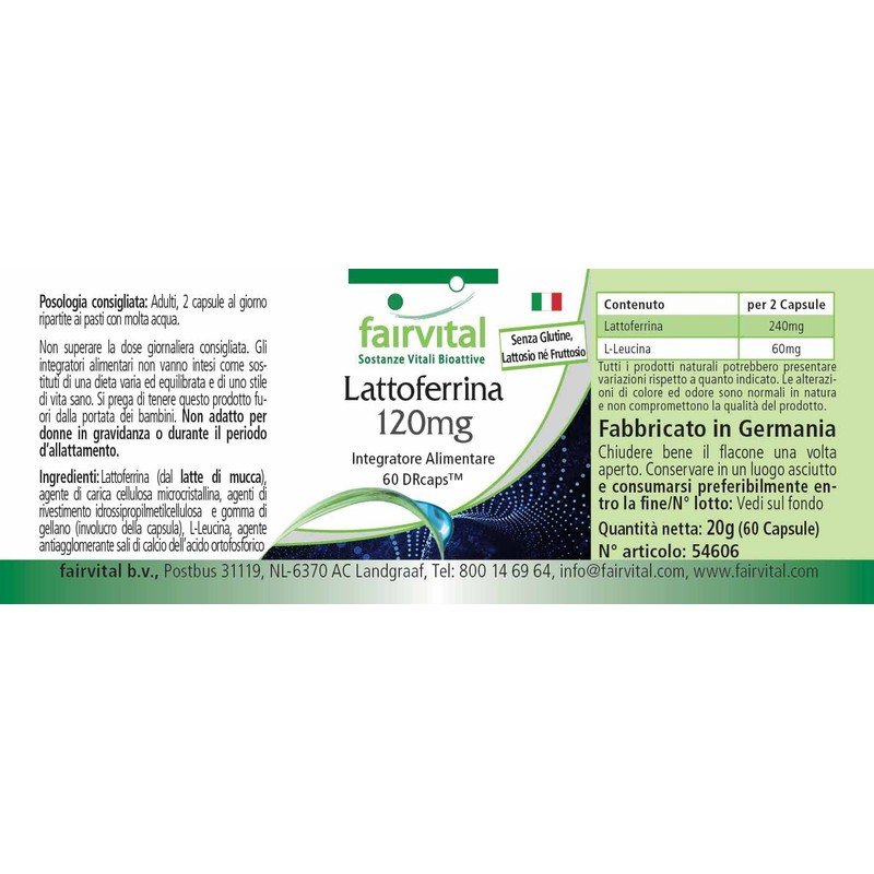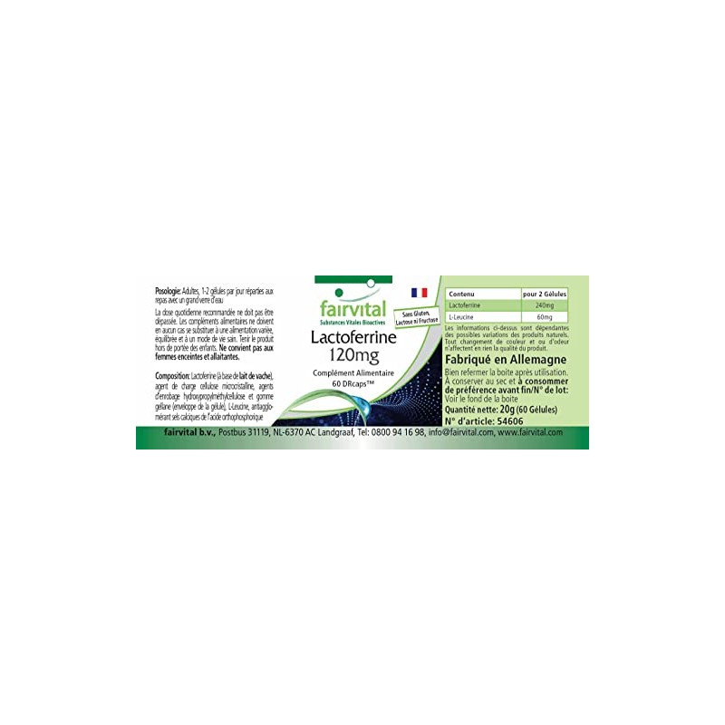- ✔ fairvital German quality: daily dose: 2 capsules per day 240 mg natural lactoferrin. The DRcap used ensures that the lactoferrin is protected from stomach acid and only unfolds in the intestine