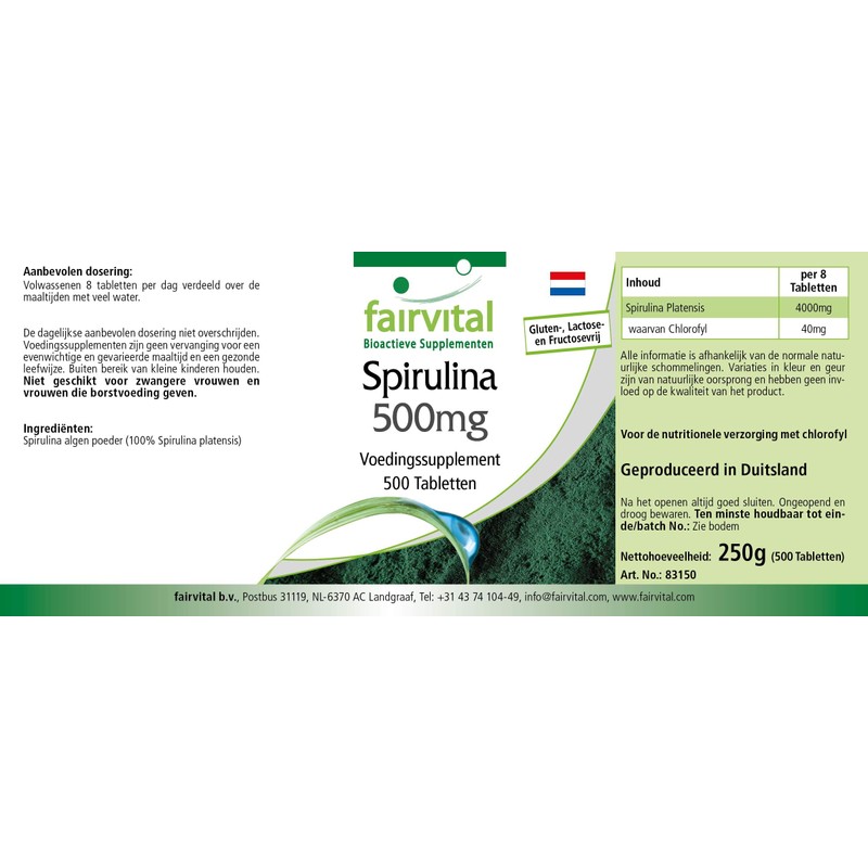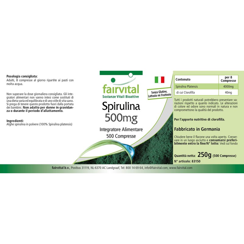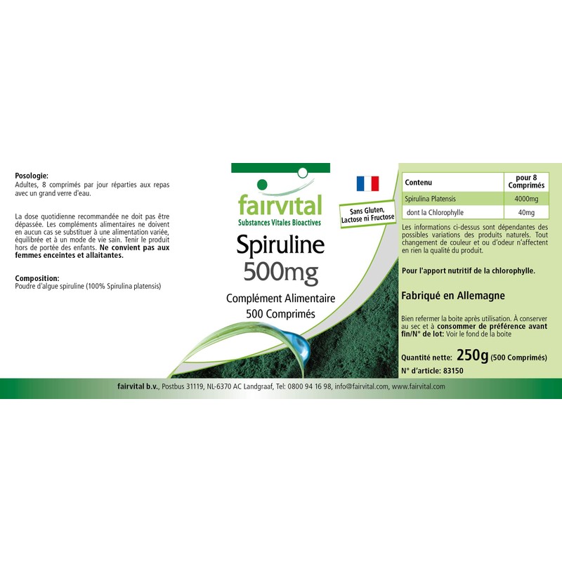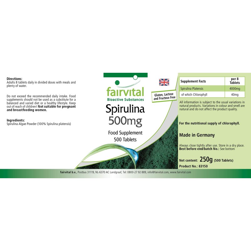 - ✔ fairvital German quality: daily dose: 8 tablets per day contain 4000 mg spirulina, of which 40 mg chlorophyll. High dose. Excellent value for money! Spirulina as a pure substance without additives.