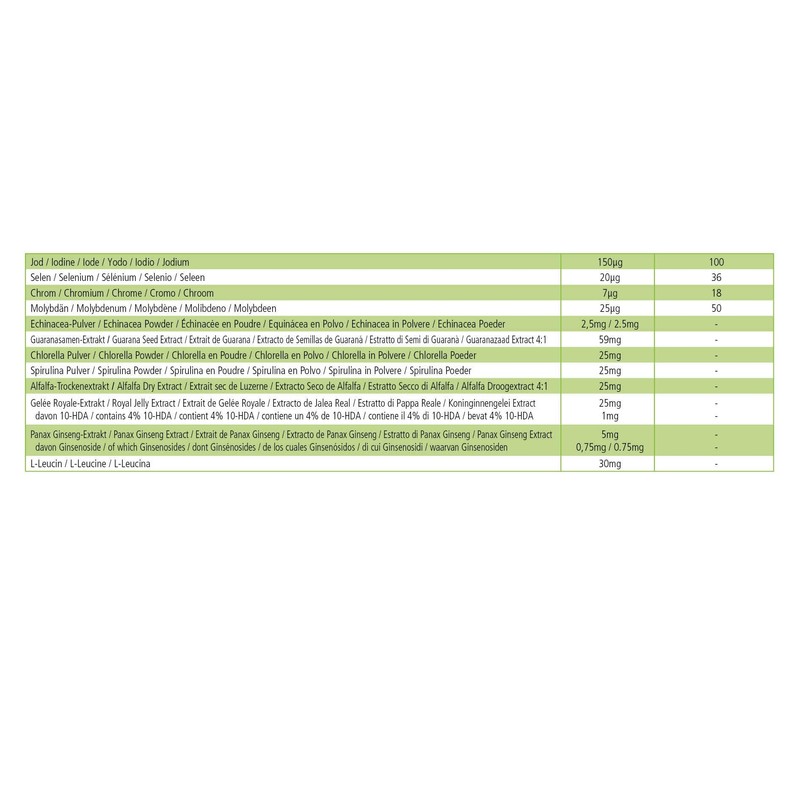 Ingredients: calcium carbonate, coating agent hydroxypropylmethylcellulose (capsule shell), magnesium oxide, guarana seed extract 4:1, D-alpha-tocopheryl acetate, filler microcrystalline cellulose, calcium L-ascorbate, L-leucine, spirulina powder, royal jelly extract (freeze-dried. contains 4% 10-HDA), alfalfa dry extract 4:1, chlorella powder, nicotinamide, zinc citrate, potassium iodide, beta-carotene, calcium D pantothenate, manganese gluconate, thiamine mononitrate, iron (II) sulfate, riboflavin, selenium yeast, cottonseed oil, pyridoxine hydrochloride, copper glucon. Panatatatatatatseng extract (contains 15% ginsenosides), echinacea powder, cholecalciferol, pteroyl monoglutamic acid, phytomenadion, sodium molybdate, chromium III picolinate, methylcobalamin, D-biotin.