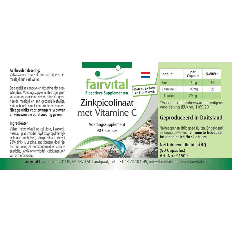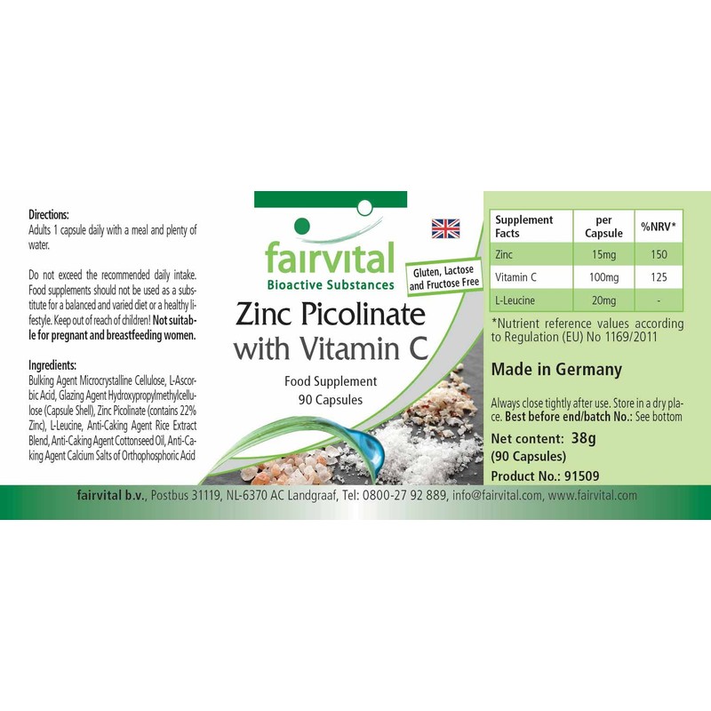 - ✔ fairvital German quality: daily dose: 1 capsule per day contains 15 mg zinc and 100 mg vitamin C. High dose. Excellent value for money! Zinc contributes to the maintenance of normal skin, hair, nails and bones. Vitamin C and zinc contribute to the normal functioning of the immune system.