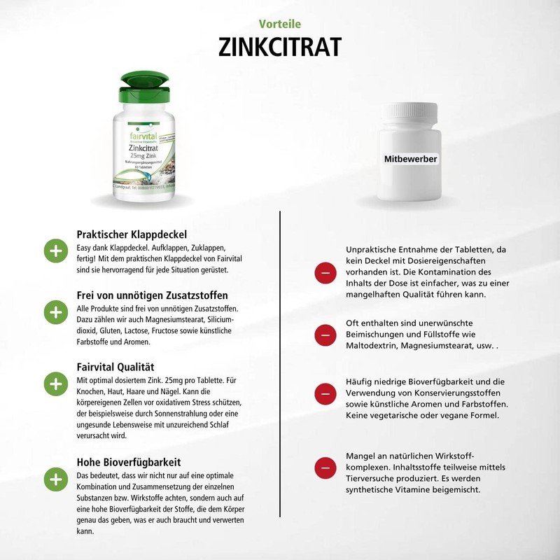 - ✔ fairvital German quality: daily dose: 1 tablet per day contains 25 mg zinc. High dose. Excellent value for money! Zinc contributes to the normal functioning of the immune system as well as the maintenance of normal skin, hair, nails and bones.
