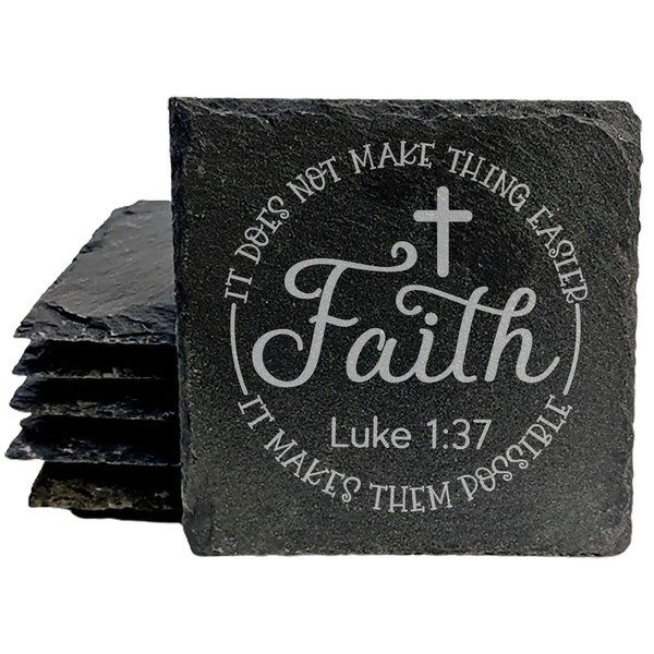 Faith and Hope: Laser Etched Slate Coasters: "Faith" Luke 1:37 with Elegant Cross Design - Square Slate - set of 8