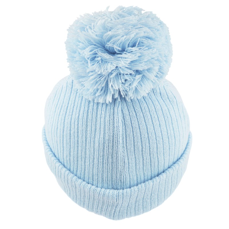 - Cute ribbed knitted pom pom hats for babies with chin ties, large 10cm pom, warm lining and an adjustable turn-up cuff