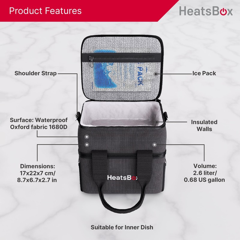 Multi-Functional CompartmentsStay organized with the bag’s thoughtfully designed compartments. The lower compartment securely holds any HeatsBox, while the upper compartment is perfect for your inner dish. This dual-storage system allows you to transport multiple meals effortlessly, making it ideal for family outings or group events.