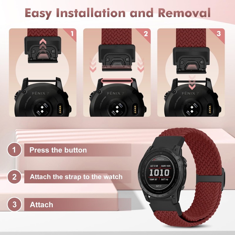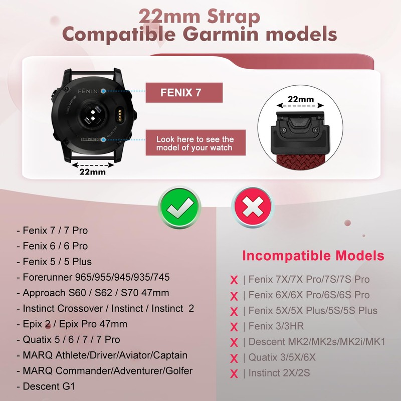 - 【Compatibility】FAKBKE 22mm elastic braided strap compatible with Garmin Fenix 7 / 7 Pro/7 Solar/7 Sapphire/Fenix 6 / 6 Pro/Fenix 5 / 5 Plus/Epix 1/2 / Epix Pro 47mm/Approach S60 / S62 / S70 47mm/Quatix 5 / 6 / 7 / 7 Pro/Instinct Crossover / Instinct / Instinct / Instinct 2, Also suitable for other 22mm Garmin watches. Please measure the width of your lugs before purchasing.