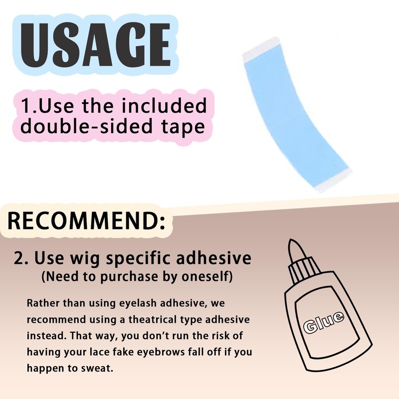 - Usage introduction: Apply an appropriate amount of glue on the back, stick it on clean and dry skin, let it dry for about 3-5 minutes, press firmly, and wipe off the spilled glue.Rather than using eyelash adhesive, we recommend using a theatrical type adhesive instead. That way, you don't run the risk of having your lace eyebrows fall off if you happen to sweat.