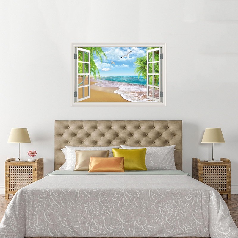 Fake Window Wall Decal Summer Beach Ocean Coconut Trees Sticker Faux Window Poster Picture Open Art Decor, Stick and Peel Wallpaper Natural Scenery Serene Sea Seascape Scene Mural(16"x24")