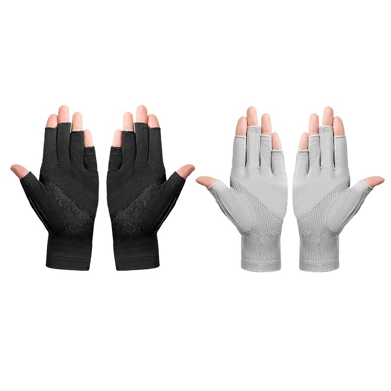 FakeFace 2Pairs Women Men UV Protection Driving Glove Summer Sunblock Glove Non-slip Breathable Fingerless Cycling Glove (Black+Light Gray)