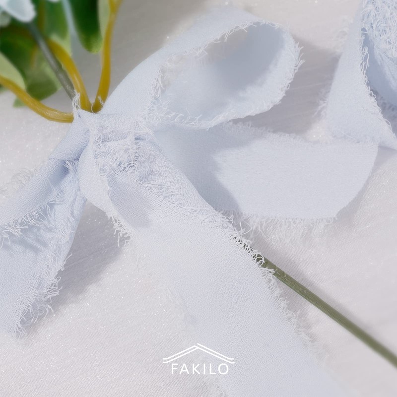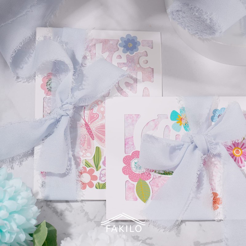 FAKILO Handmade Fringe Chiffon Ribbon 4 Rolls 1 Inch x 5 Yd Light Blue Ribbon, 20 Yd Chiffon Silk Ribbon for Wedding Invitations, Bridal Bouquets, Gifts Wrapping, DIY Crafts
