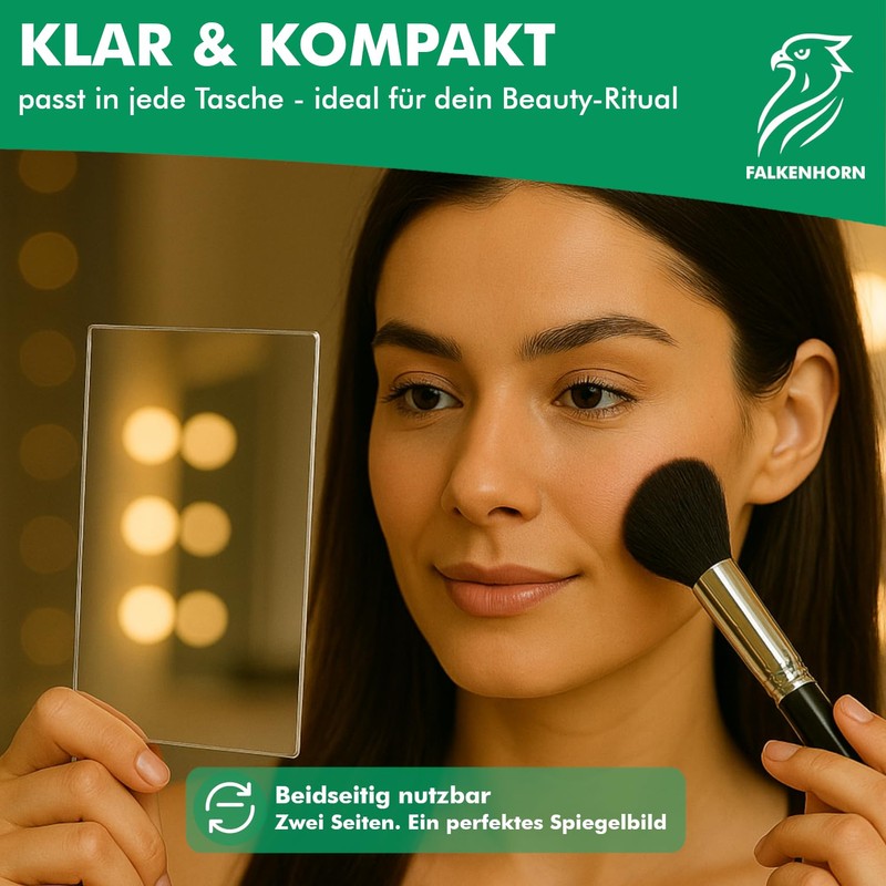 - 🔸 ULTRAFLACH, FEDERLEICHT & DOPPELSEITIG VERGLAST Die FALKENHORN Spiegel bestehen aus nur 1 mm dünnem Acryl, sind extrem leicht und auf beiden Seiten verspiegelt. Ideal als Taschen- oder Reisespiegel, Kompaktspiegel für Kosmetik oder zum Basteln und Dekorieren.